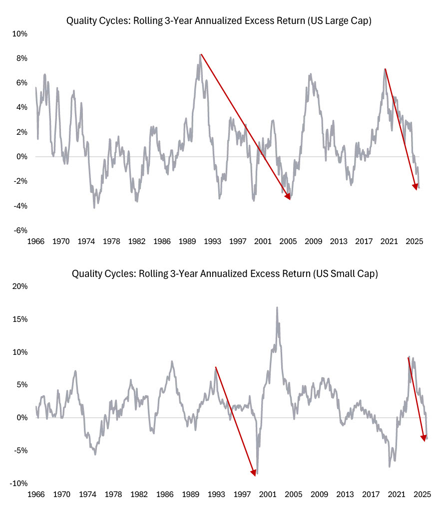 Importantly, this is not unprecedented. During the mid-to-late 1990s, amid the rise of the internet, quality experienced a prolonged stretch of relative underperformance (see nearby charts). It was not a brief anomaly, but a sustained cycle driven by enthusiasm for transformative growth and the repricing of future opportunity. While the cycle eventually turned, the adjustment was neither quick nor predictable. If history offers any guidance, factor cycles tied to major technological shifts can persist longer than many expect.