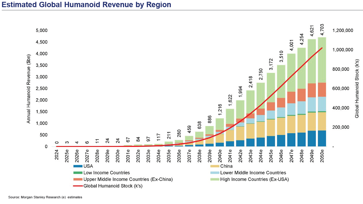 • AI Gets a Body. After transforming the digital world, AI is now stepping into the physical one through humanoid robotics. What once lived on screens is moving into factories, homes, and streets. Morgan Stanley projects humanoid robots could represent a $5 trillion annual revenue market by 2050 on par with the global auto industry today. This isn’t incremental; it’s revolutionary in redefining labor economics.